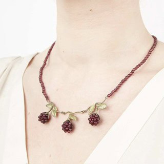 Materials: The Raspberry necklace features cast bronze leaves and three garnet raspberries on a garnet beads chain.